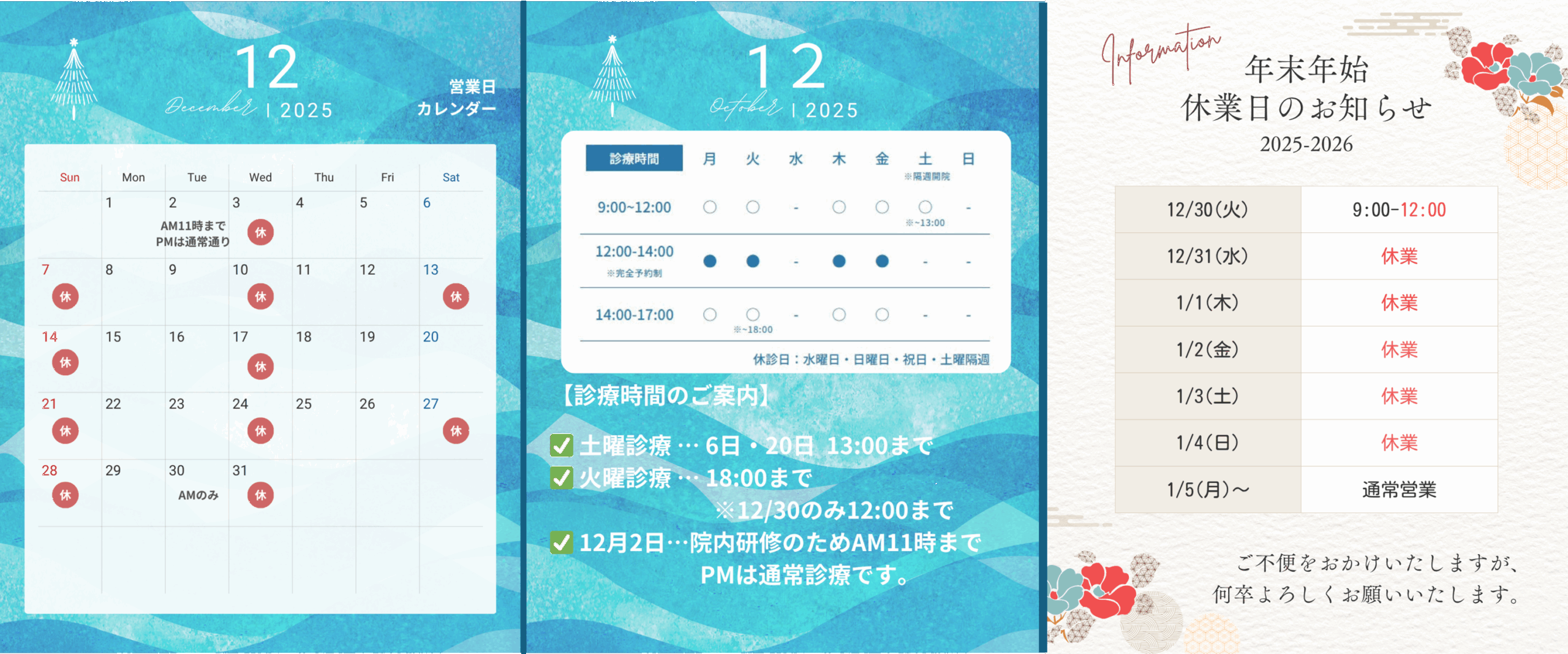 ・12/30(火)→【午前のみの診療】です。この日が年末の最終診療日となります。普段の火曜日は午後まで診療しておりますが、この日は午前中のみとなりますため、お間違えないようお気をつけください。